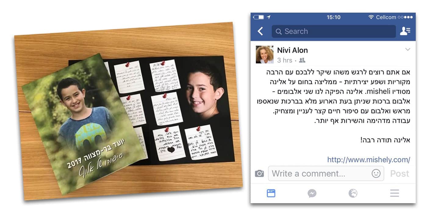 אם אתם רוצים לרגש משהו שיקר ללבכם עם הרבה מקוריות ושפע יצירתיות - ממליצה בחום על אלינה מסטודיו מישלי. לאינה הפיקה לנו שני אלבומים - אלבום ברכות שניתן בעת הארוע מלא בברכות שנאספו מראש ואלבום עם סיפור חיים קצר לעניין ומצחיק.